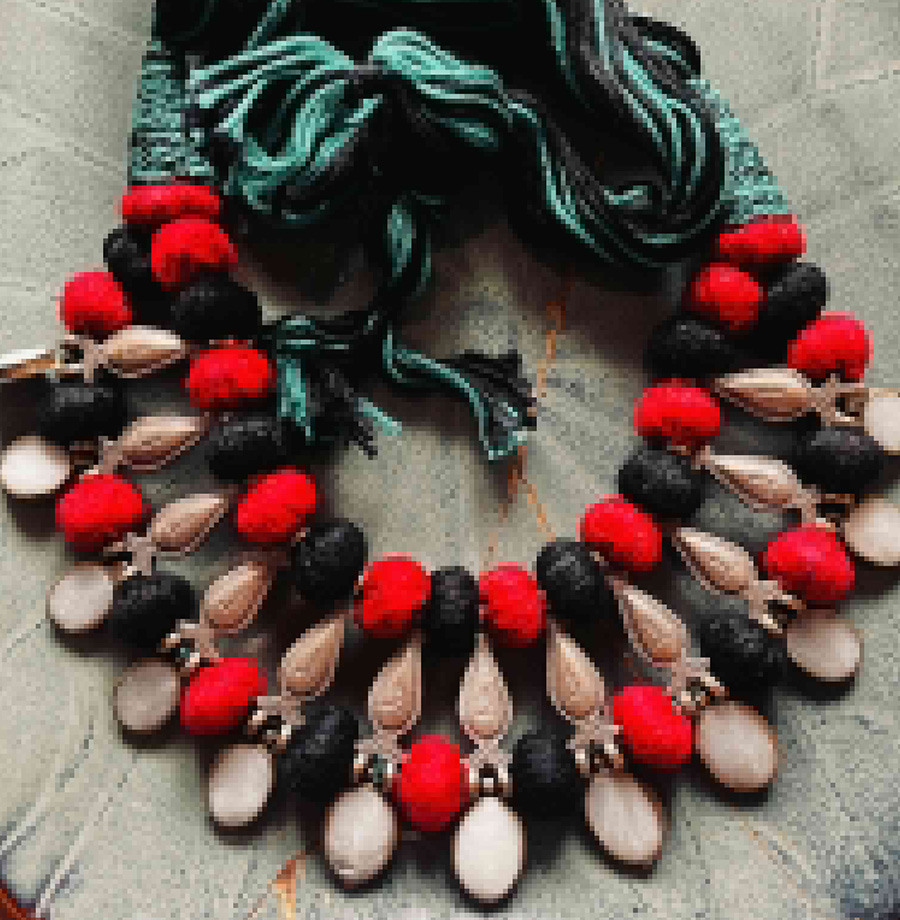 A stunning Afghani neckpiece recreated with colorful threads, metal, and natural stones. If you are looking for a showstopper, this neckpiece is the one to take home.