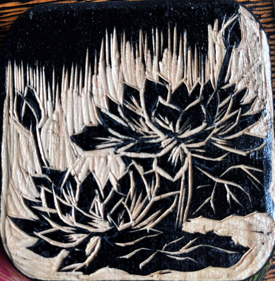 Woodcut coasters with a floral design.